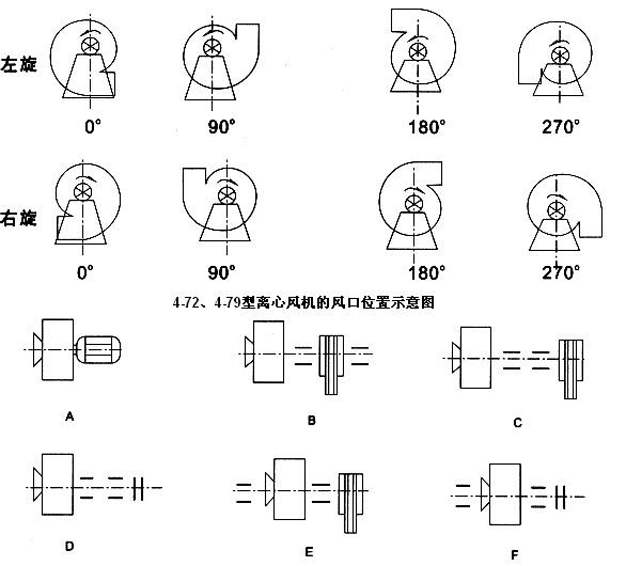 ·公司所有離心風機全部采用訂單制生產,根據客戶的使用需求,為您量身定制,讓您買的稱心用的放心。風機分左旋和右旋兩種型式,從電機(皮帶輪)側正視,葉輪按順時針方向旋轉為右旋,逆時針旋轉為左旋。A式為點擊直聯(lián)傳動。B、C、E式為皮帶傳動,D、F式為聯(lián)軸器傳動。